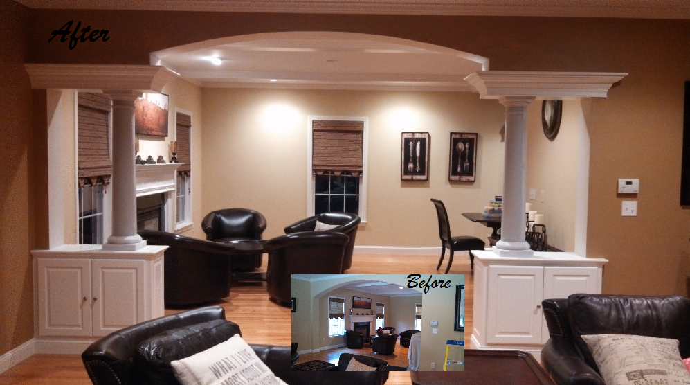 Before & After Gallery Wine cellar before Wine cellar with light 2 Wine cellar in progress WIne cellar with light Before and after columns dividing huge space. Entertainment center West Newbury Fireplace surround